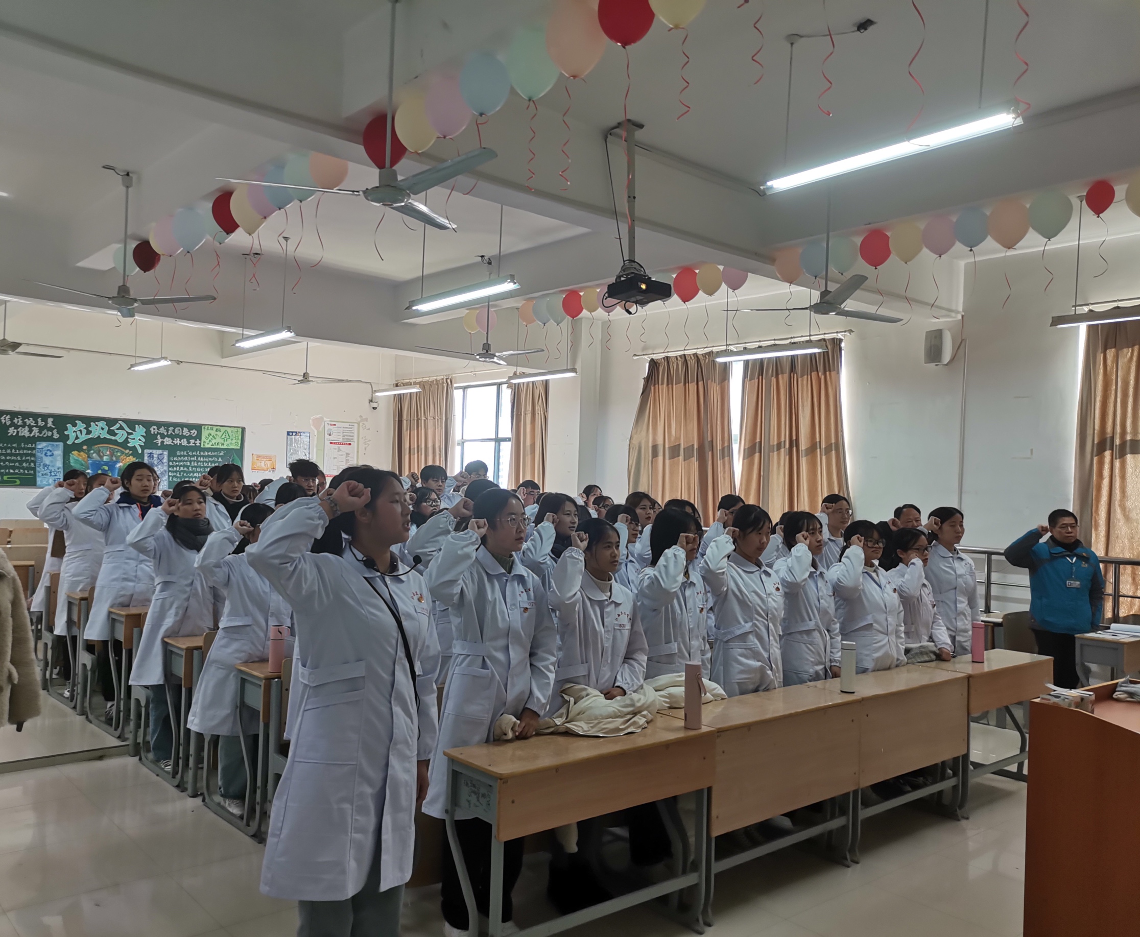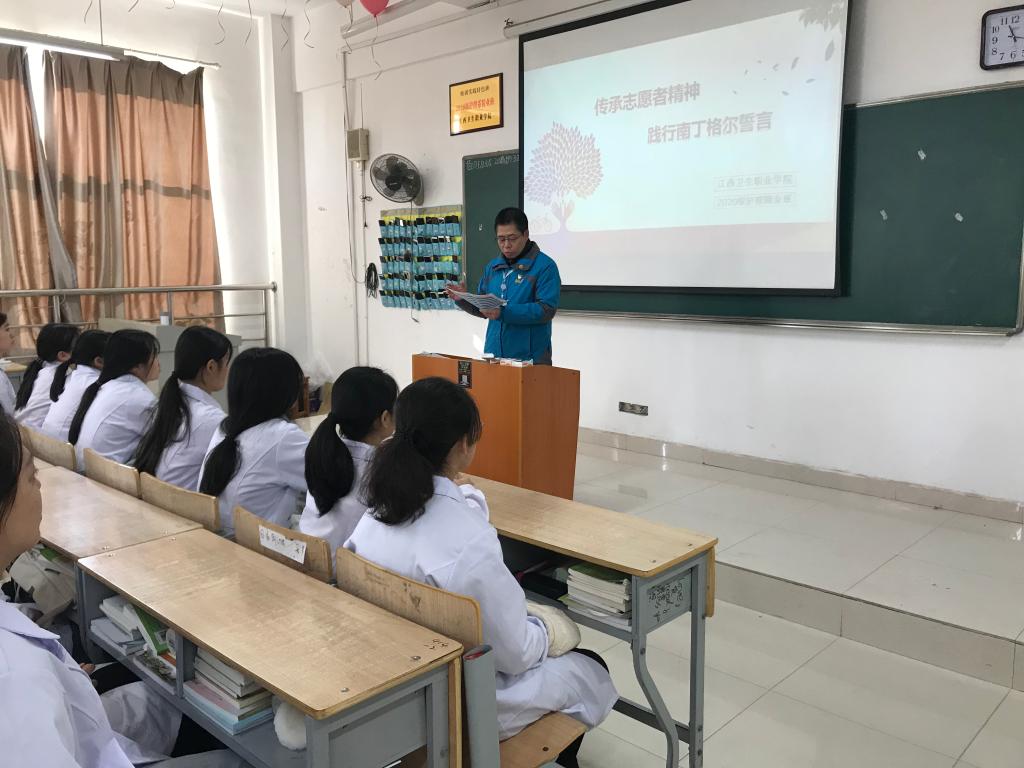 每年的12月5日为国际志愿者日,2020级护理精业班的同学们以高度的热情,围绕志愿者的奉献精神,以新时代医护人员的责任与使命为主题,开展了一场别开生面的特色班会。班会上,同学们主动发言,积极互动,并面向南丁格尔画像,进行集体宣誓。