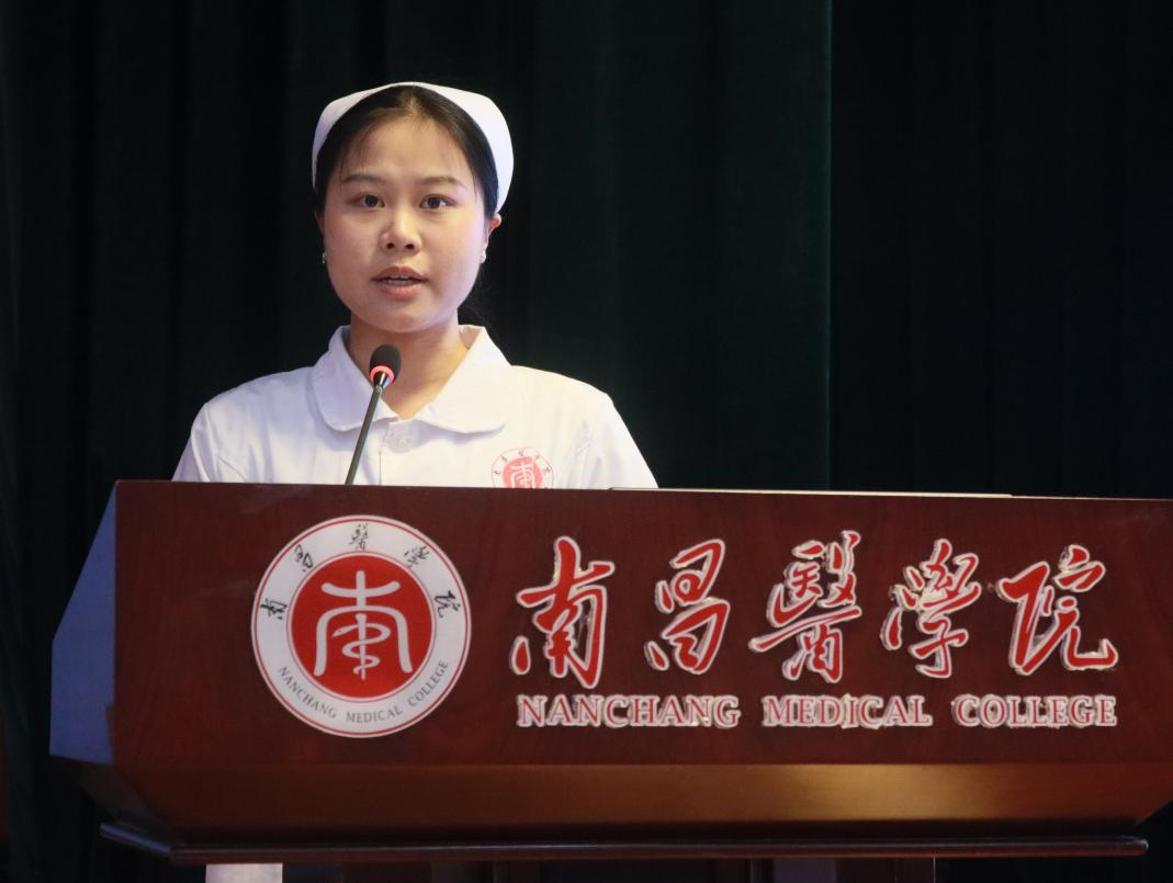 2022级护理本科3班优秀学生代表胡威同学上台发言。她结合自身学习经历,分享了对护理职业的认知与憧憬,并代表全体实习生郑重承诺:将恪守南丁格尔精神,以严谨的态度对待实习任务,虚心求教、团结协作,在临床实践中锤炼技能、服务患者,不负学院培养与师长嘱托。